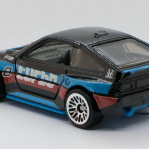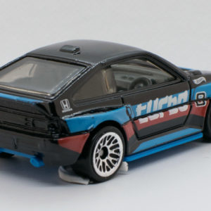 This black Honda has blue and red stripes and “Turbo” door decor. Its clear windows shield a grey interior, and chrome laced wheels roll under its blue plastic chassis.