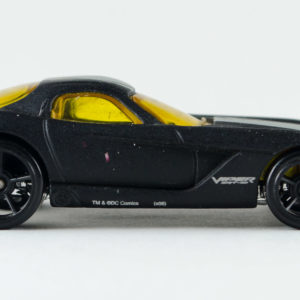 This flat black Viper features grey stripes, a Batman logo on the hood, and Viper logos on the front fenders. Its yellow windows reveal a black interior, and the chrome plastic base rides on OH5 wheels.