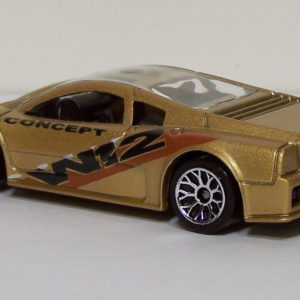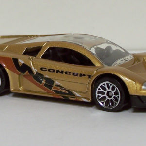 This Meyers Manx features metallic gold paint and a black Manx symbol and flames on the hood. It had a smoked windshield, tan interior, unpainted metal base, and rolls on chrome-rimmed grey CM5 wheels.